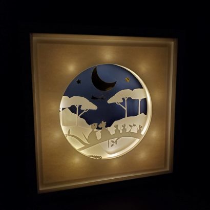 | Matériaux | Cadre bois, Eclairage Led à piles (fournies), Papier épais haute qualité, Plexiglas, Stickers dorés |