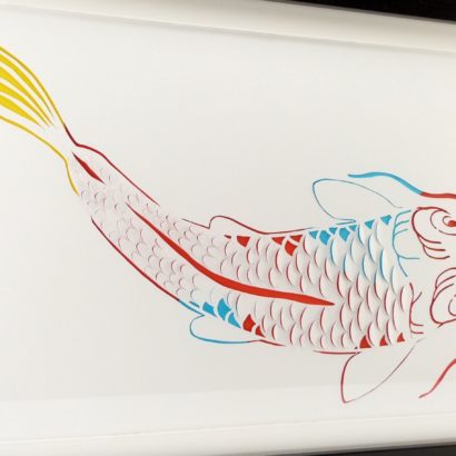 Composés de papier épais haut de gamme encollé, les pétales sont dressés un à un pour donner un bel effet 3D. Le jeu de transparence est saisissant, particulièrement quand on se déplace dans la pièce. Les formes géométriques se modifient et offrent une légère illusion d’otique. L’ensemble est très harmonieux, le rouge apporte une touche assez dynamique.