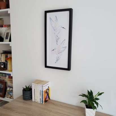 Le fond de cette composition est composé d’un camaïeu de bleus. Une autre version de ce cadre est proposée avec un fond en camaïeu de rouges. Le cadre peut être blanc ou noir en fonction de vos goûts, si vous le préférez en noir merci de me l’indiquer au moment de la commande.